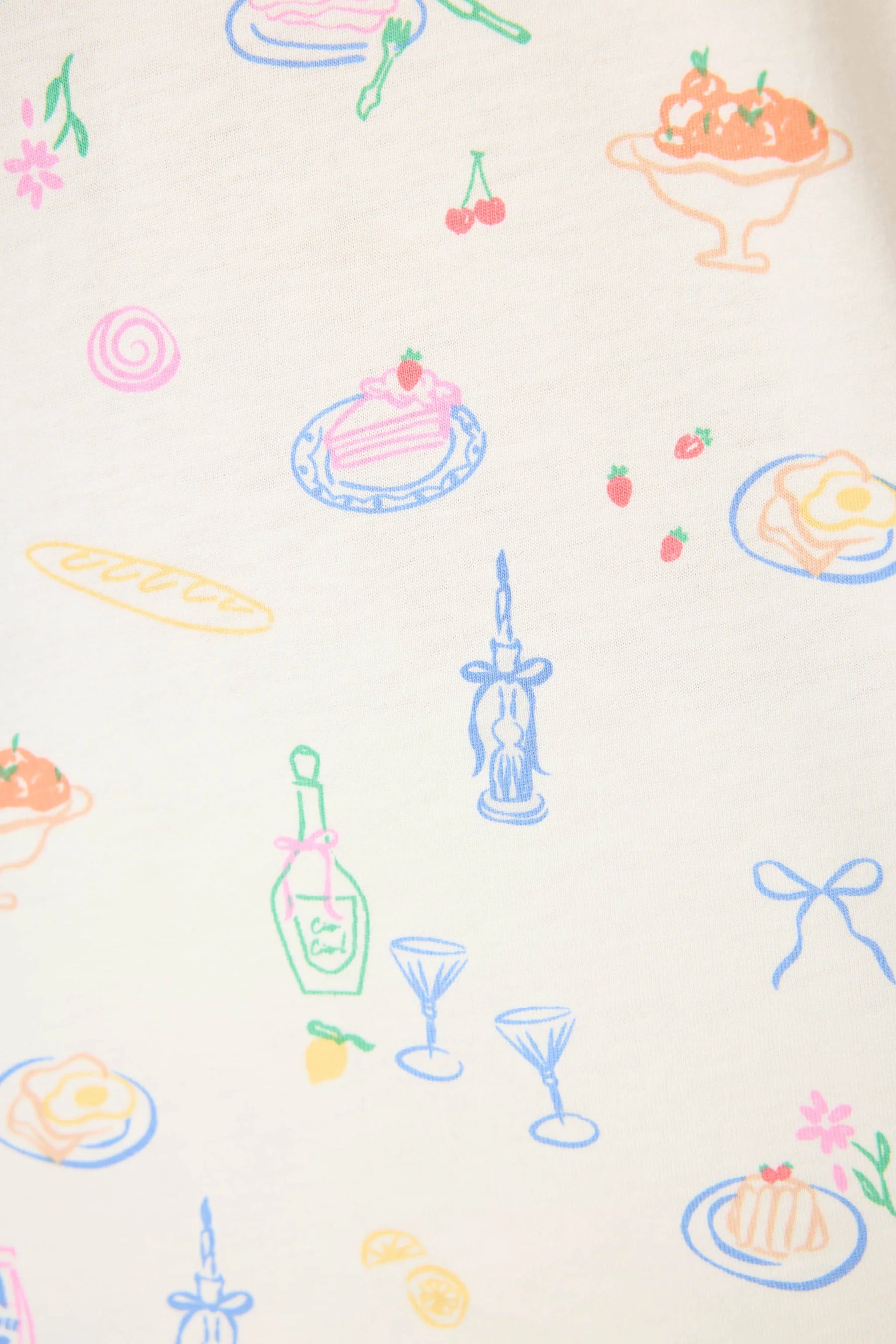 The Parisian Picnic (Ivory): For the lover of alfresco dining and breakfast in bed. This soft ivory set features a dinner-food inspired print that adds a playful, culinary wink to your off-duty routine.