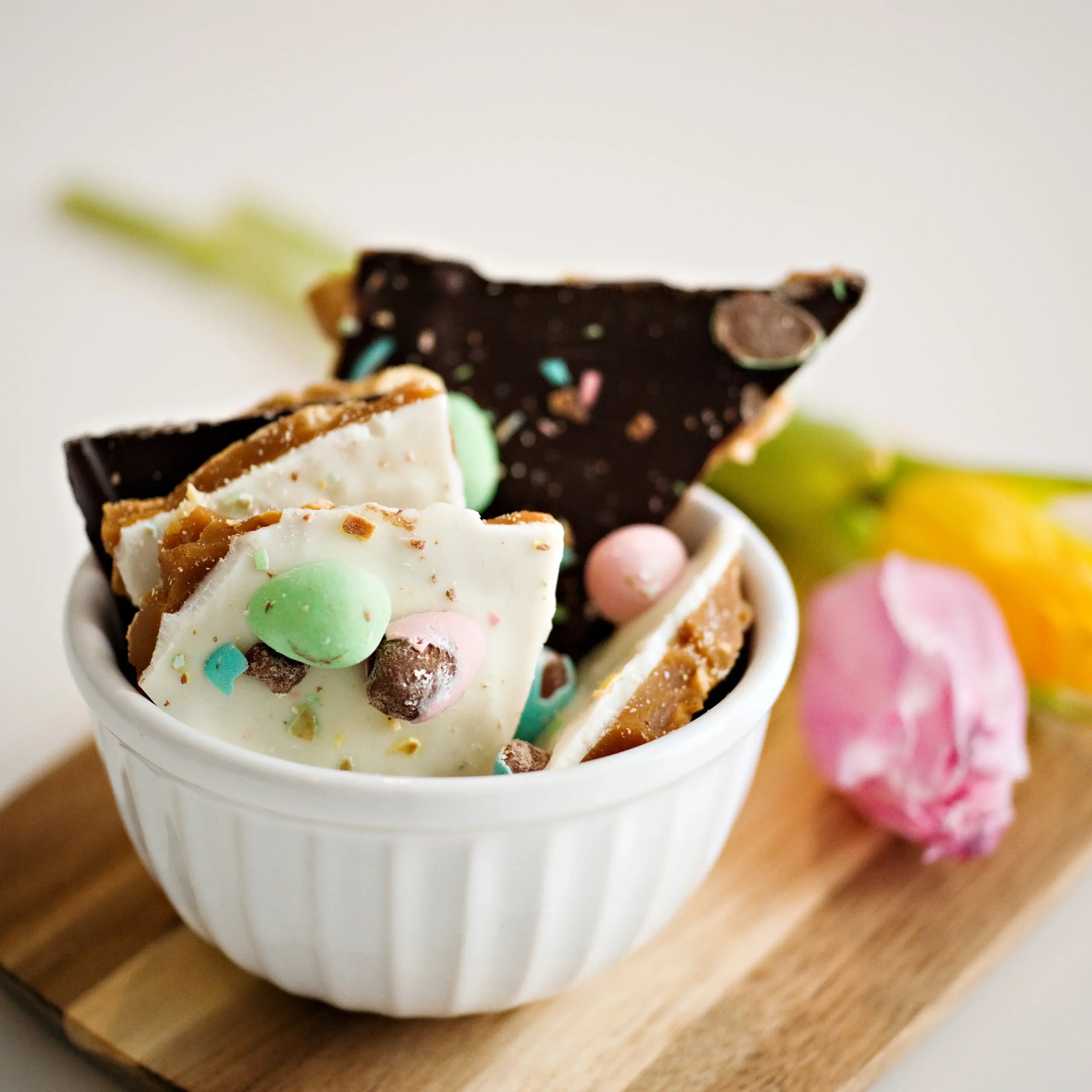 Un favori des fans ! Des couches de noix de cajou, de caramel au beurre, de chocolat blanc et noir, le tout surmonté de mini-œufs colorés. Une gourmandise de saison appréciée de tous.