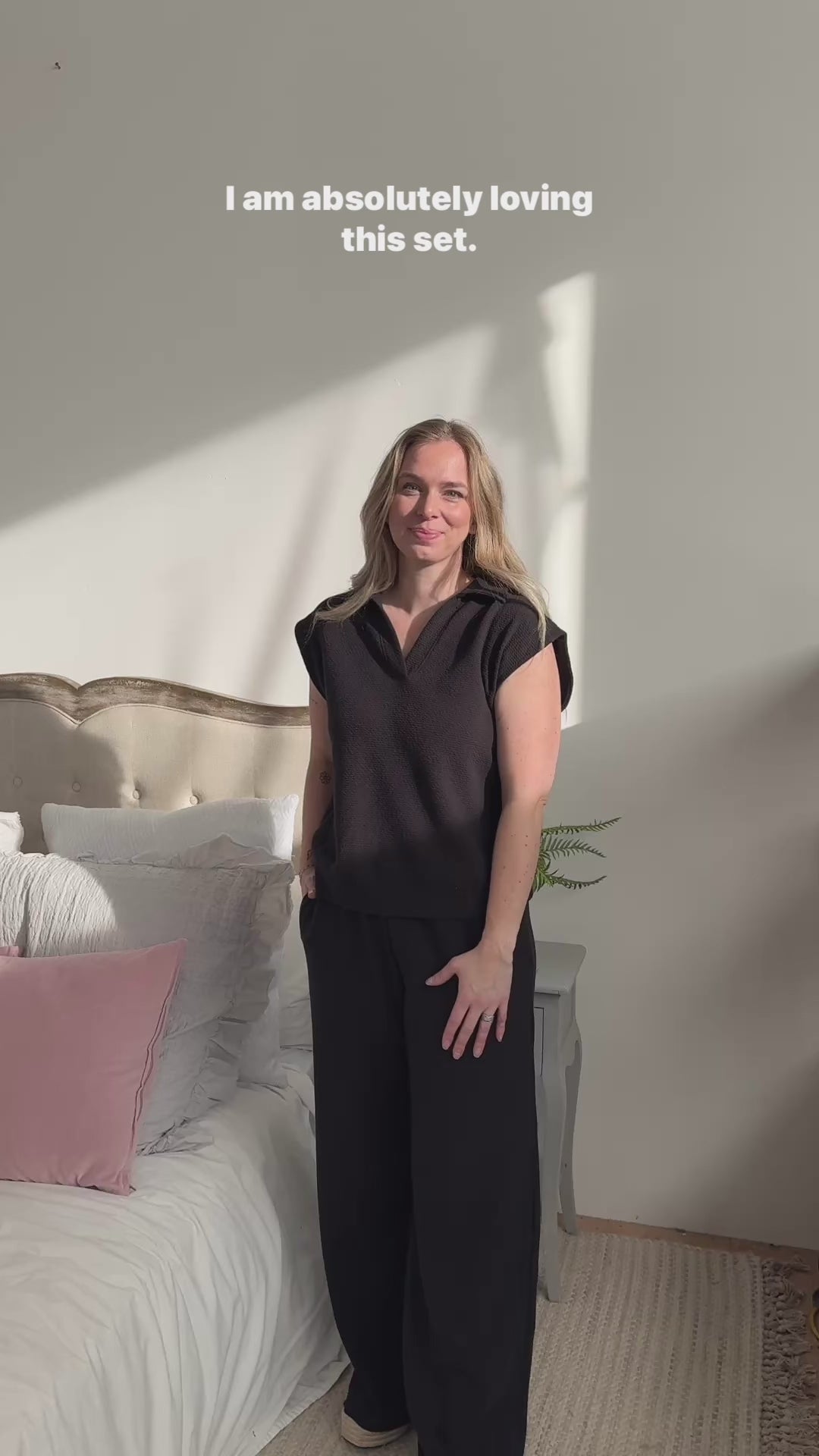 Unleash your summer vibes in this PJ Collared Top/Pant Set. Made with cloud knit fabric, this set features a preppy collared top with a v neck and wide leg pants with pockets, all in a classic black colour. Perfect for lounging or errands in style!
